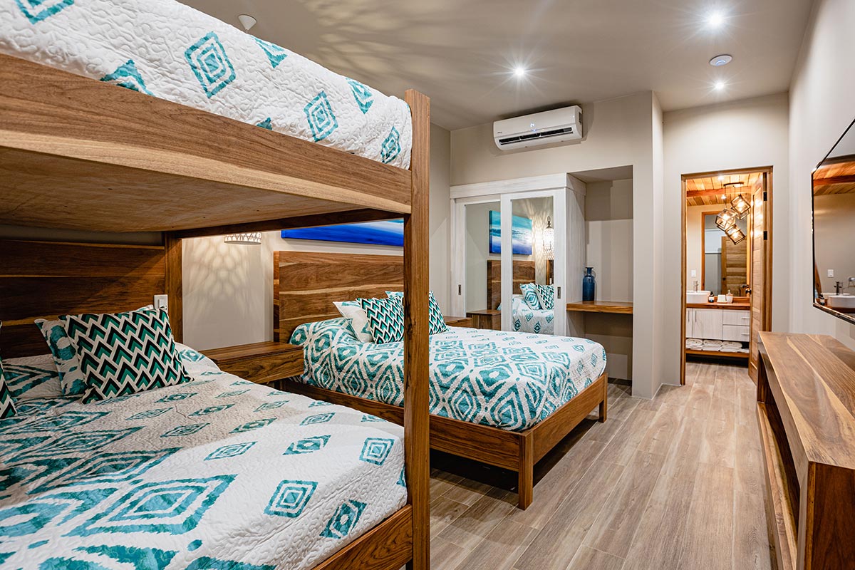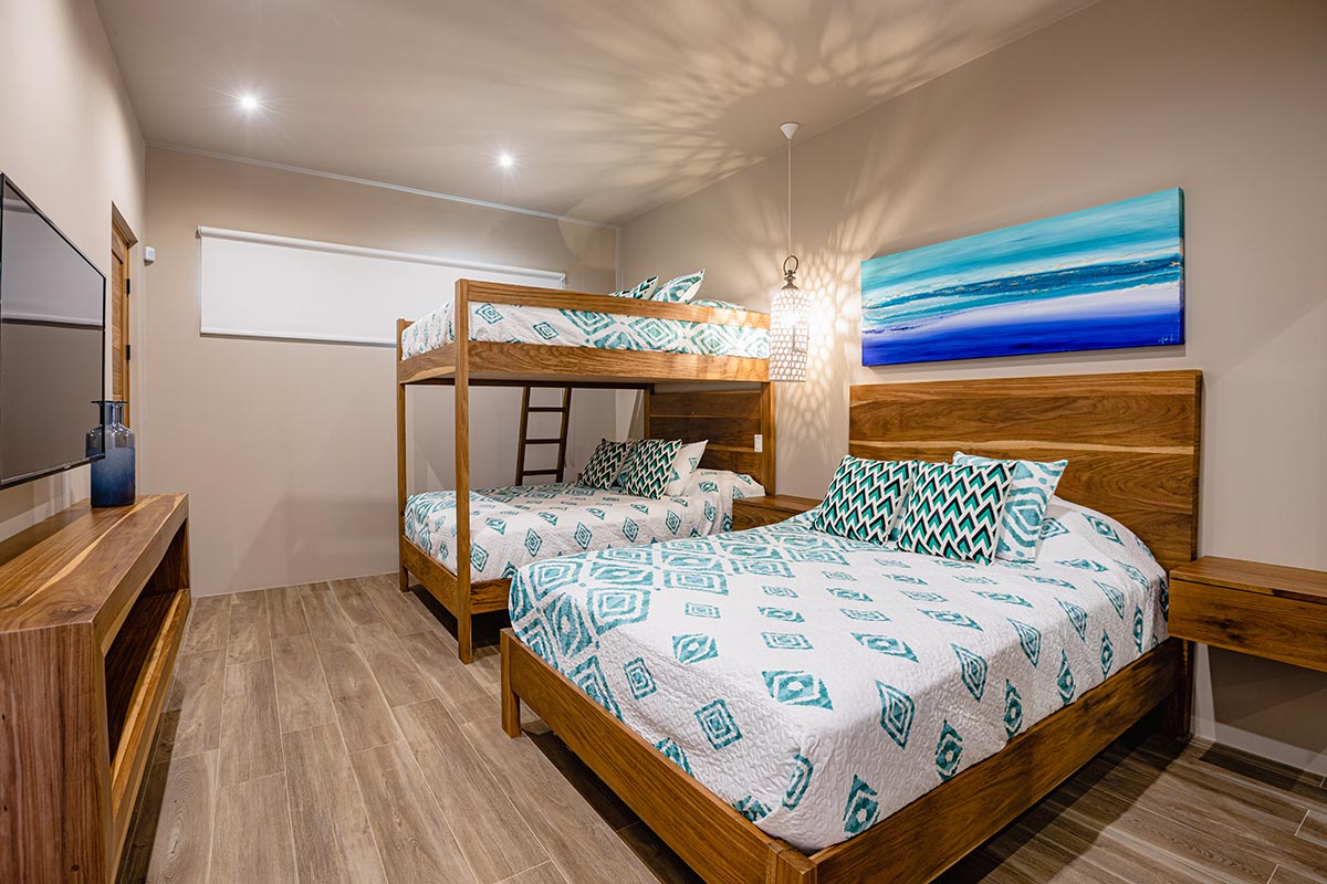 3rd Bedroom, 3 beds sleeps 6, ( 32m2 / 345 sqft )Customised Queen bunk bed and Queen bed and furniture, 'Malu' artwork, , Private ensuite with indoor showers, electronic black out blinds, 50 inch Smart Tv, Split invertor AC.