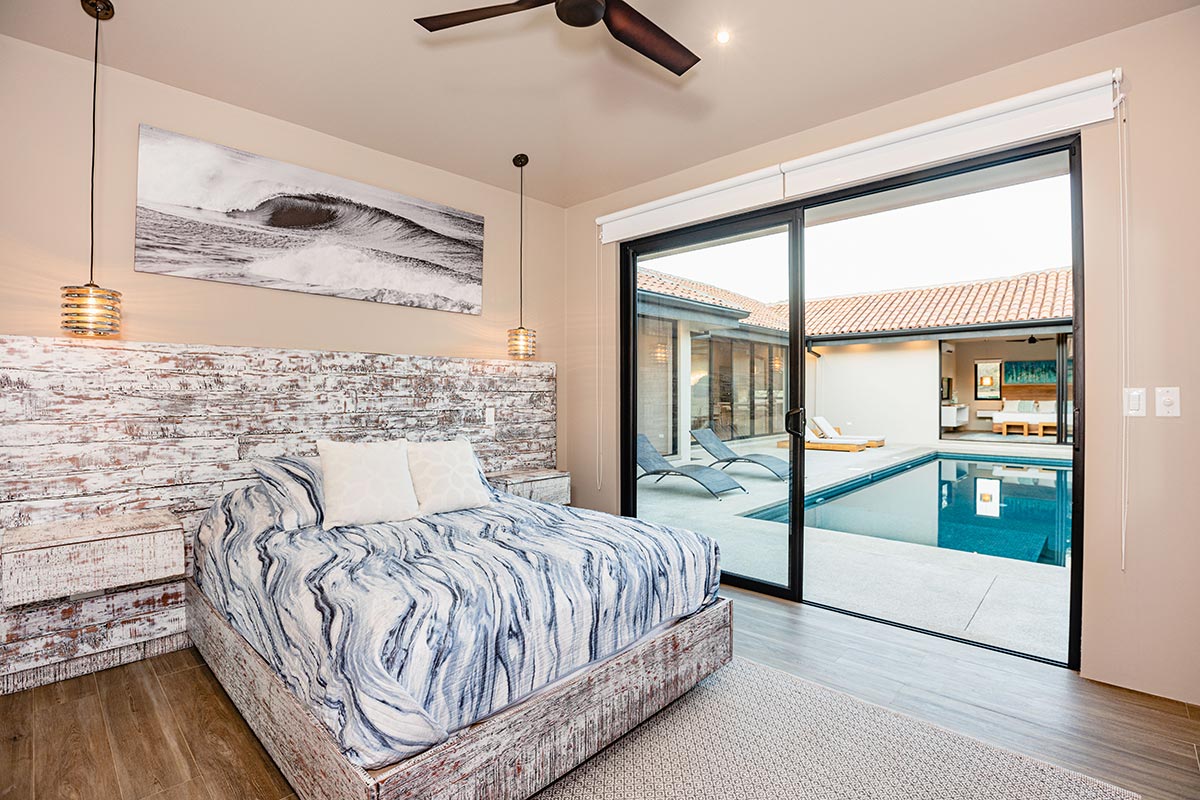 2 customised Queen Beds and furniture, 'Malu' artwork, walk in Robe, Private ensuite with tropical garden with indoor and outdoor showers, electronic black out blinds, 55 inch Smart Tv, Split invertor AC.